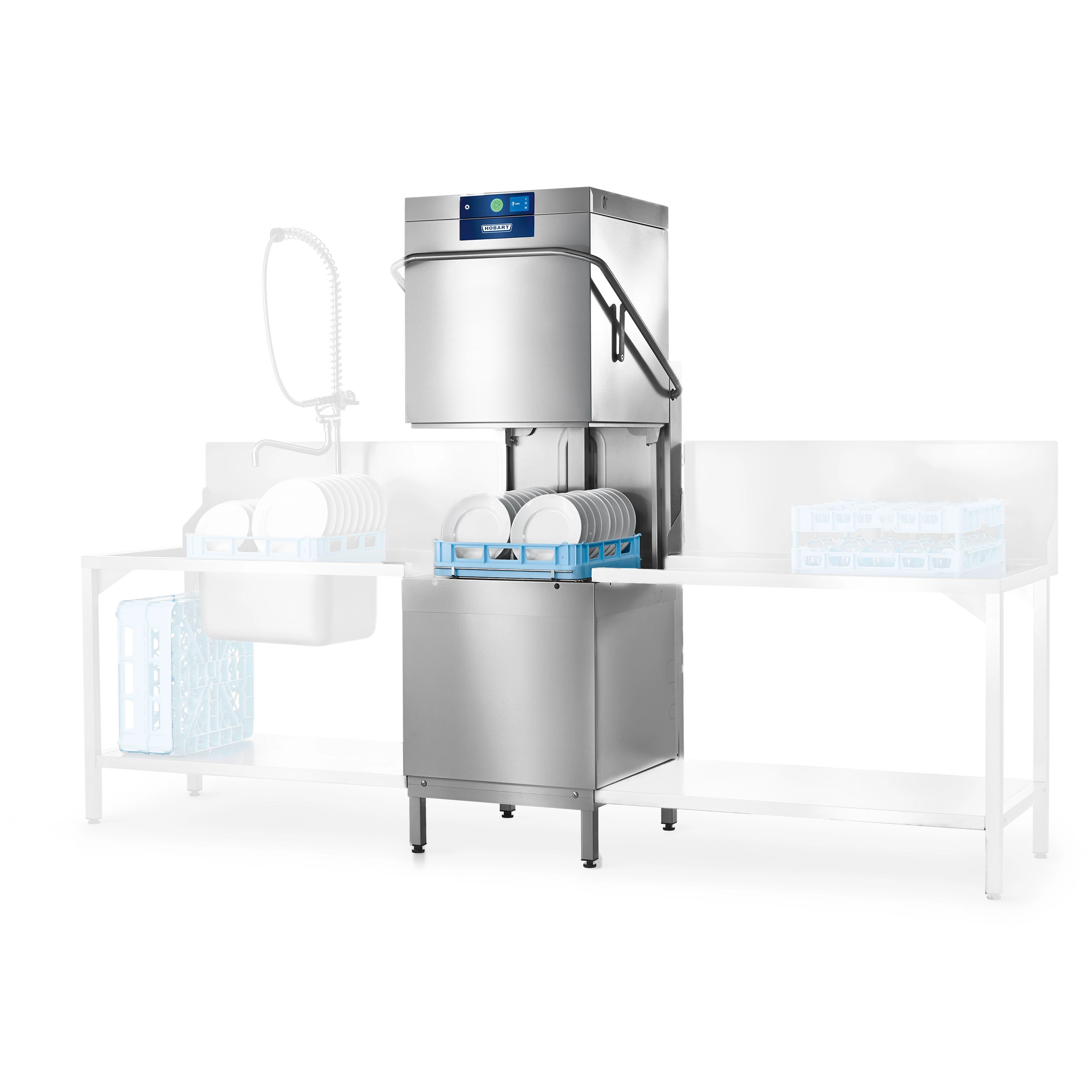 - Verschlossene Haube auf allen Seiten: Der heiße Dampf bleibt im System und entweicht nicht in den Raum. Dadurch verbessert sich das Raumklima in der Spülküche deutlich, während gleichzeitig der Energieverlust deutlich verringert wird.