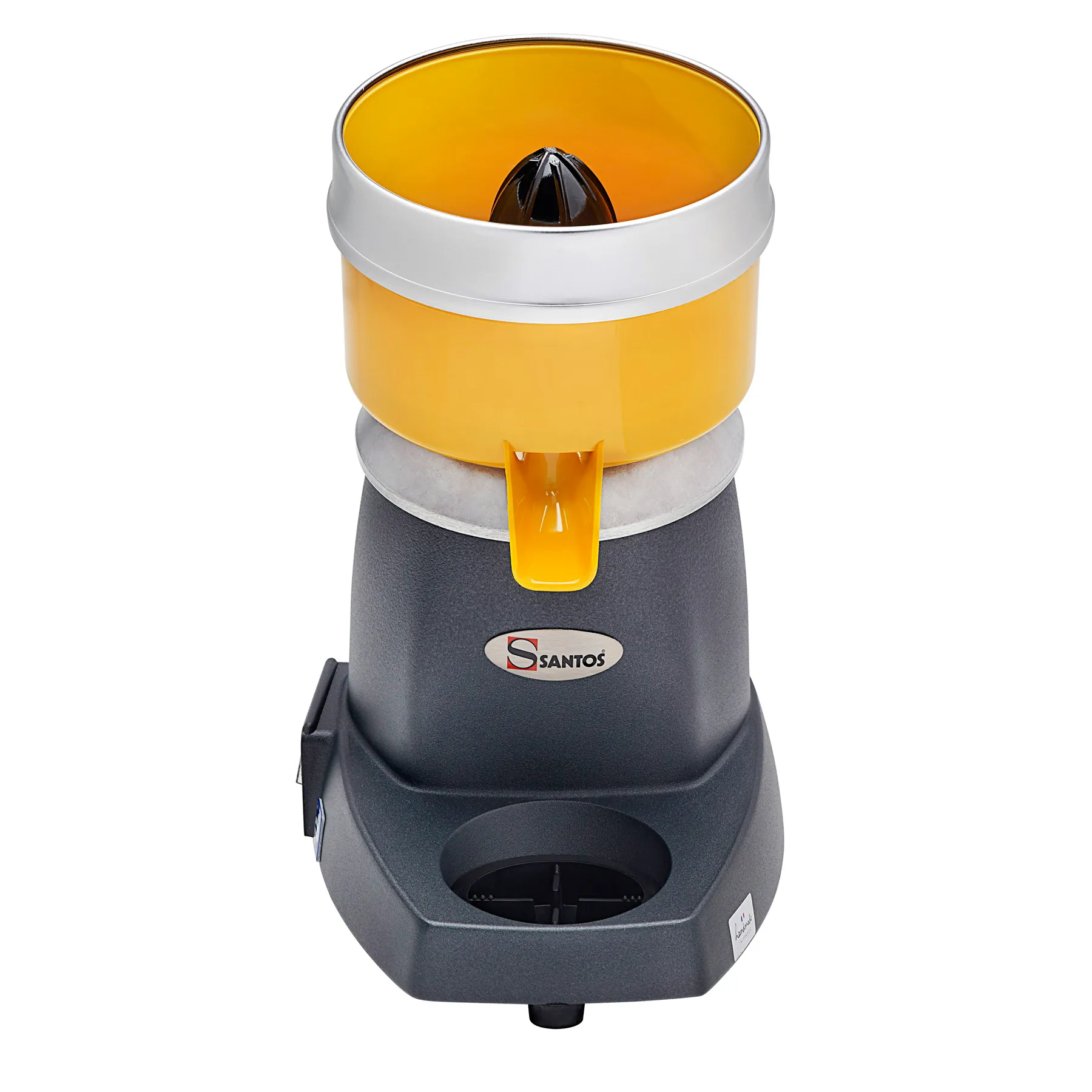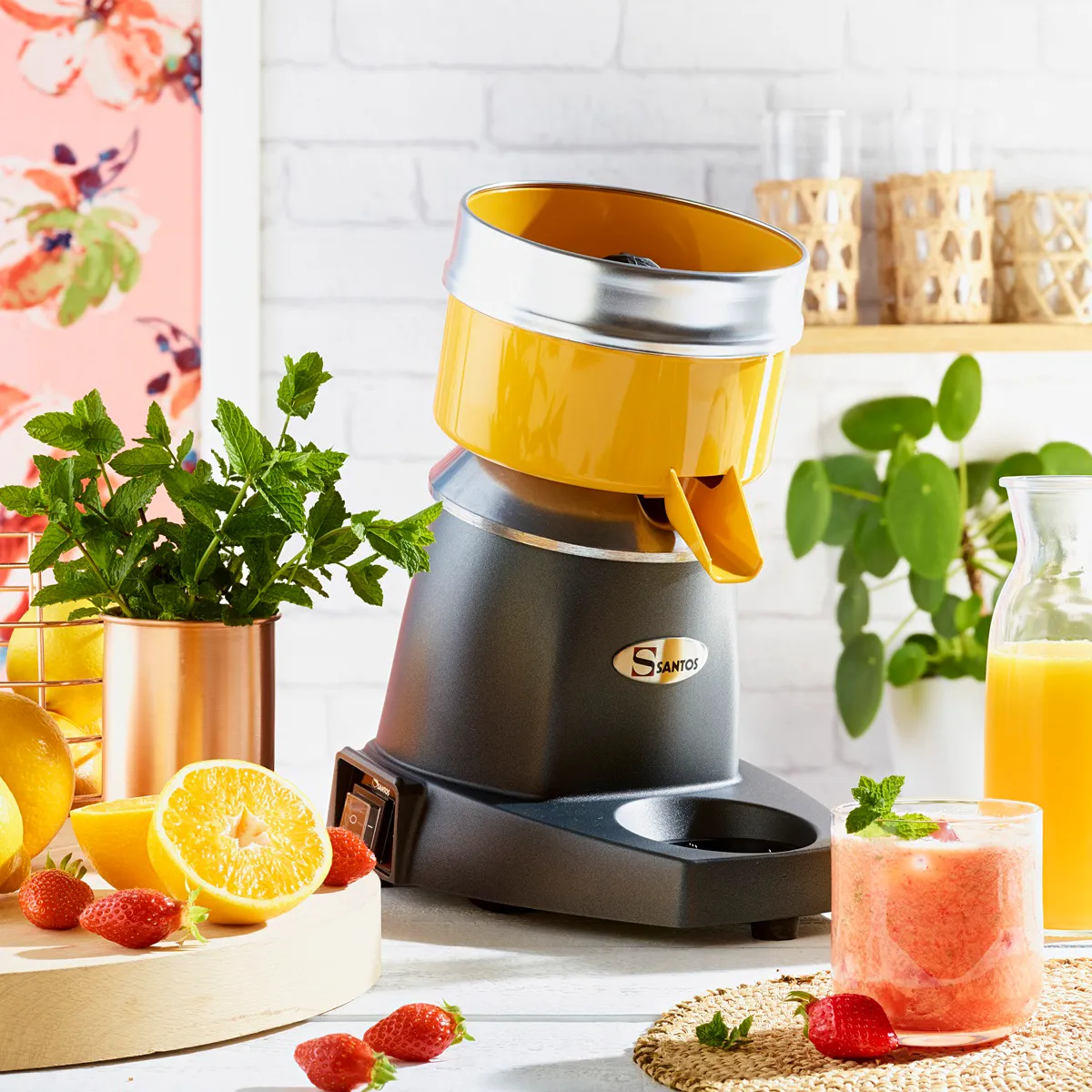 Ein Klassiker der Marke Santos denn seit über 60 Jahren wird das Gerät bereits schon produziert. Die Santos Saftpresse Nr. 11 presst bis zu 30 Liter frischen und vitaminreichen Saft pro Stunde. Die drei verschiedenen mitgelieferten Presskegel ermöglichen es unterschiedliche Früchte wie etwa Limetten, Zitronen, Orangen oder Grapefruit zu pressen. Durch die kleinere Ausgusshöhe von 125 mm kann der Saft dabei direkt ins Glas gepresst werden. Der grau lackierte Gehäusesockel bestehend aus Aluminium ist leicht, handlich und schnell zu reinigen. Die Saftschale ist in einen leuchtenden Orange gehalten und ist zudem abnehmbar.