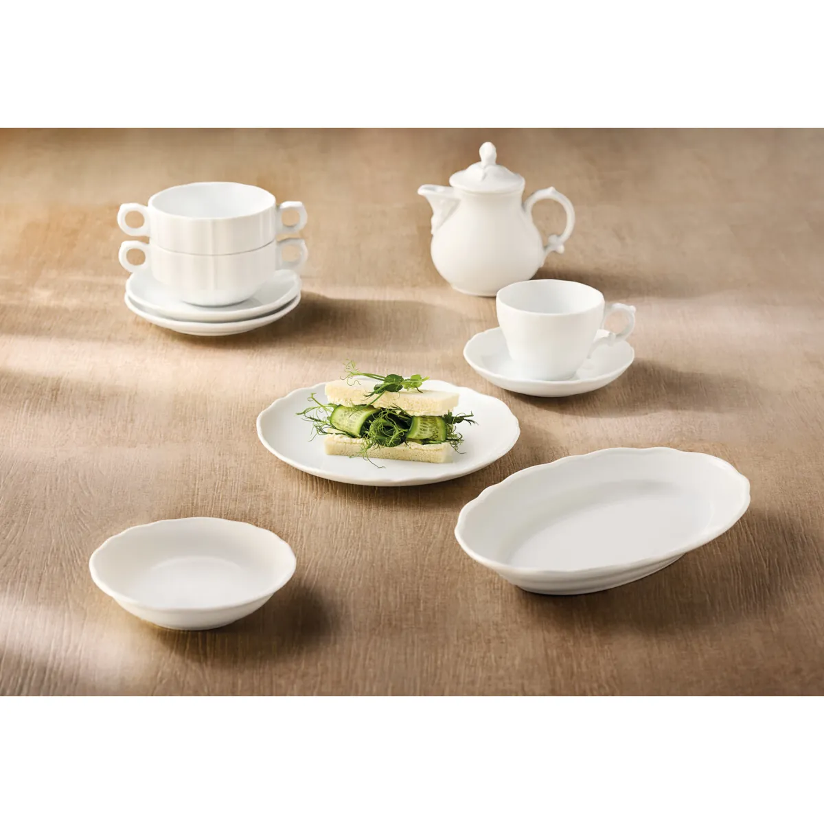 Entdecken Sie die elegante Bauscher Serie Marie Christine, die mit ihrem barocken Charme begeistert. Die filigranen Rosenmotive auf Kannen und Zuckerdose verleihen Ihrem Tisch eine romantische und festliche Atmosphäre. Besonders hervorzuheben ist der festorientierte Rand an den Tellern, der für eine elegante Optik sorgt. Perfekt geeignet für festliche Anlässe oder um Ihrem Alltag einen Hauch von Luxus zu verleihen. Gönnen Sie sich hochwertige Keramik mit zeitlos schönem Design – diese Serie macht jeden Moment zu etwas Besonderem. Sie möchten nicht nur das klassische weiße Geschirr auf Ihrem Tisch, so hält die Serie Marie Christine drei Dekore zur Auswahl bereit, wie Nostalgia, Rose Blossom und Ambras. Gern können Sie diese Dekore bei uns anfragen. Diese Untertasse ist Teil der renommierten Marie Christine Kollektion, die für ihre feine Porzellanqualität und ihr klassisches Design bekannt ist. Die Untertasse besticht durch ihre zarte, geschwungene Form und die filigranen Verzierungen, die jedem Tischgedeck einen Hauch von Raffinesse verleihen.  Ideal für den täglichen Gebrauch oder besondere Anlässe, passt die Untertasse perfekt zu verschiedenen Tassen. Sie ist die perfekte Ergänzung für Ihre Kaffeetafel und sorgt dafür, dass jede Tasse Kaffee oder Tee stilvoll präsentiert wird. Gönnen Sie sich oder Ihren Liebsten dieses elegante Stück und bringen Sie einen Hauch von Luxus in Ihr Zuhause. Die Bauscher Marie Christine Untertasse – für unvergessliche Genussmomente.Eigenschaften: Durchmesser: cm Höhe: cm Gewicht: g spülmaschinengeeignet mikrowellengeeignet