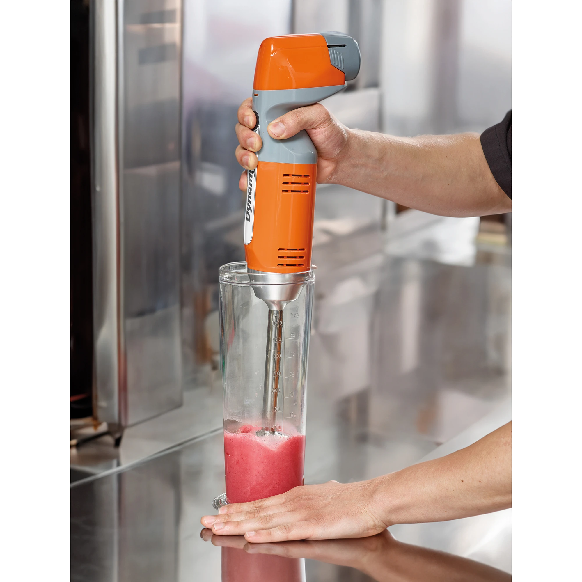 Der Dynamic Mixstab Dynamix DMX 190 V2 ist ein unverzichtbares Werkzeug für jeden Hobbykoch und Profi. Der Mixstab verfügt über zwei Geschwindigkeiten, die es Ihnen ermöglichen, die Konsistenz Ihrer Speisen perfekt anzupassen. Egal ob Sie Suppen, Saucen, Smoothies oder Pürees zubereiten möchten, mit dem Dynamic Mixstab können Sie die Geschwindigkeit je nach Bedarf anpassen und somit ein optimales Ergebnis erzielen. Ein weiteres Highlight  ist der abnehmbare Mixstab. Dies ermöglicht Ihnen eine einfache Reinigung und sorgt dafür, dass Sie auch schwer erreichbare Stellen problemlos säubern können. Eigenschaften: Farbe: Orange / Schwarz (Dieser Stabmixer ist auch in den Farben Rot/Schwarz und Weiß/Schwarz zum gleichen Preis erhältlich. Gern fragen wir wir für Sie die Verfügbarkeit beim Hersteller an)Messer mit 4 Klingen Verarbeitungsmengen:  1 - 8 Liter Hinweis: Der Mixstab sollte umgehend nach der Benutzung gereinigt werden, indem Sie den Mixer in einen Behälter mit Wasser halten und das Gerät 3 Sekunden laufen lassen.