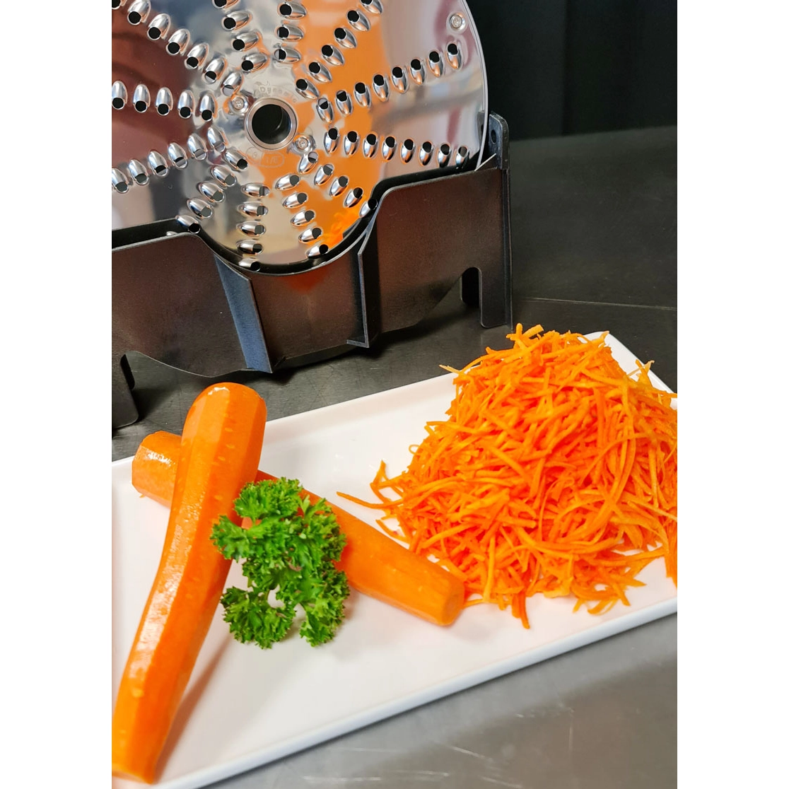Der perfekte Partner in der professionellen Küche zum Schneiden, Zerkleinern, Vermengen und Emulgieren diverser Zutaten. Dieser innovative Gemüseschneider ist mit einem ergonomisch geformten Griff ausgestattet, der sowohl für Rechts- als auch für Linkshänder optimal geeignet ist.Eigenschaften:  Geschwindigkeit: 320 U/minVerarbeitungsmenge: 1 - 300 Kg / Stunde Spülmaschinen feste Teile sind: Schneidkammer; Schiebegriff; Schacht und Hebelder breiteste Durchmesser auf dem Markt Hinweis: Bitte beachten Sie, dass die Scheiben NICHT im Lieferumfang enthalten sind, die verschiedenen Schneidscheiben finden Sie unter ZUBEHÖR.